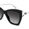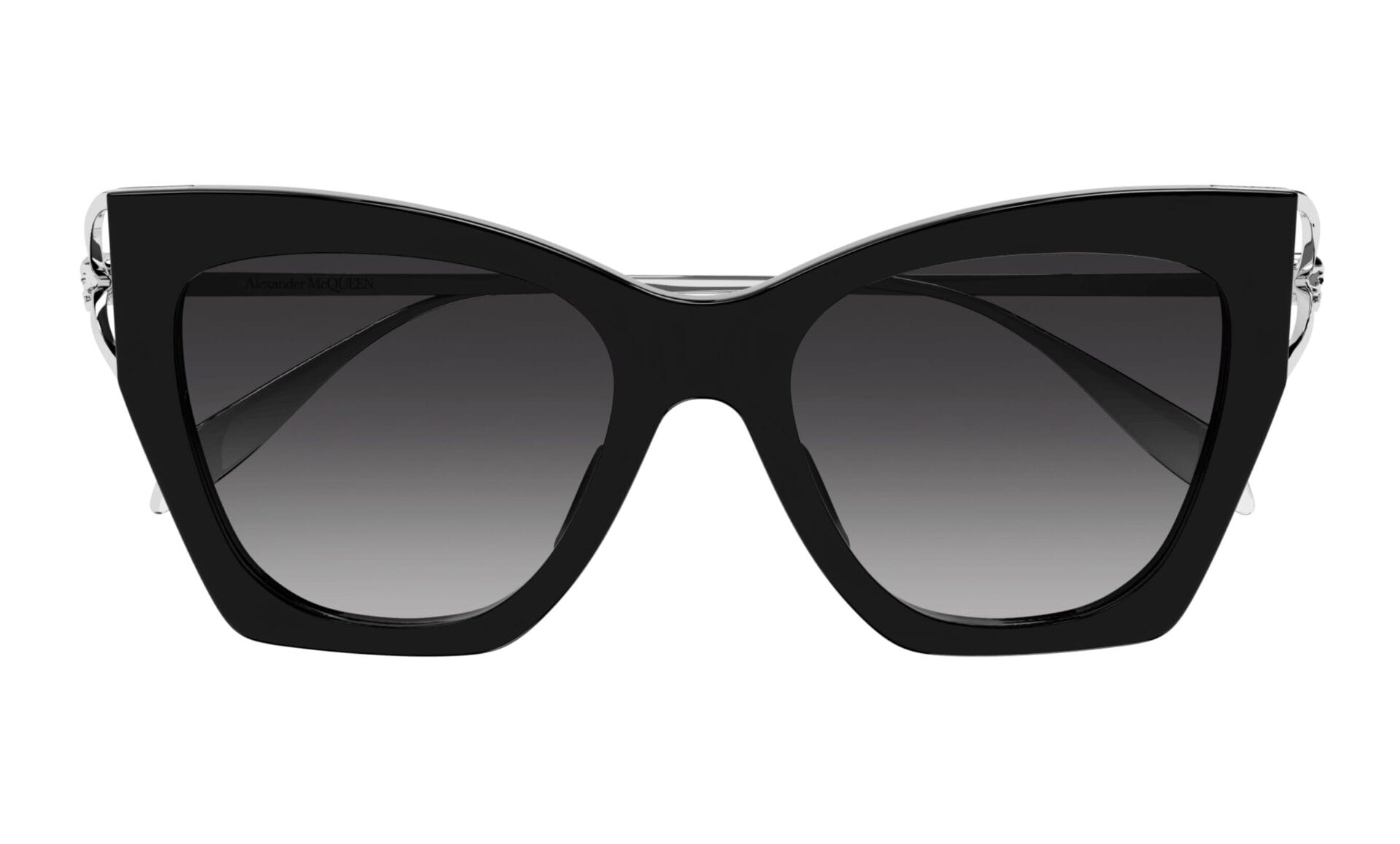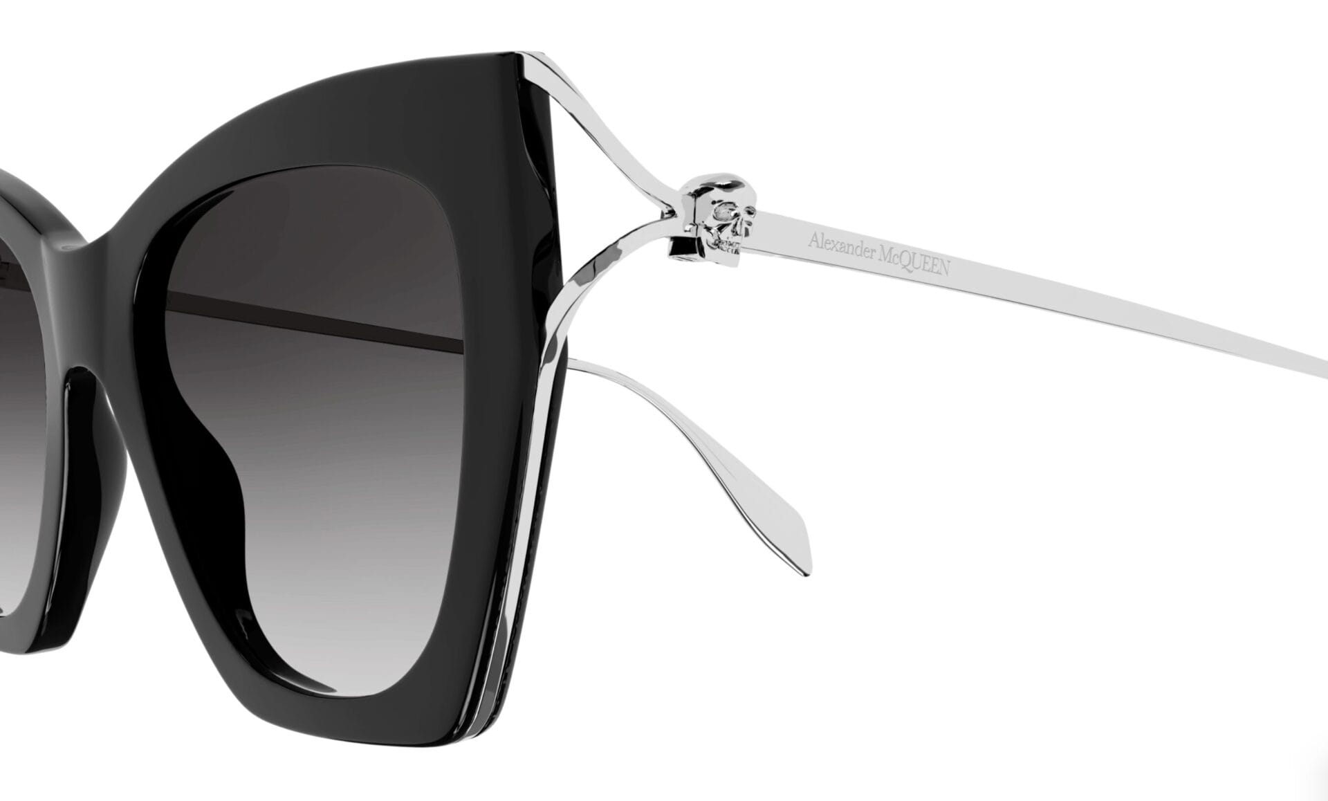 Familia de ochelari Skull Hinge combină elementul furculiță cu craniul, semnătură iconică a ofertei Alexander McQueen, propunându-l ca o notă subtilă, dar recognoscibilă. Ochelari de soare feminini cu model cat eye, cu parte frontală din acetat și branșă metalică cu o construcție în formă de furcă care se termină cu un craniu. Logo-ul Alexander McQueen este gravat cu laser pe branșe. Branșele strălucitoare aurii și argintii sunt asortate cu nuanțe clasice sau moderne ale părții frontale și lentile în gradient.